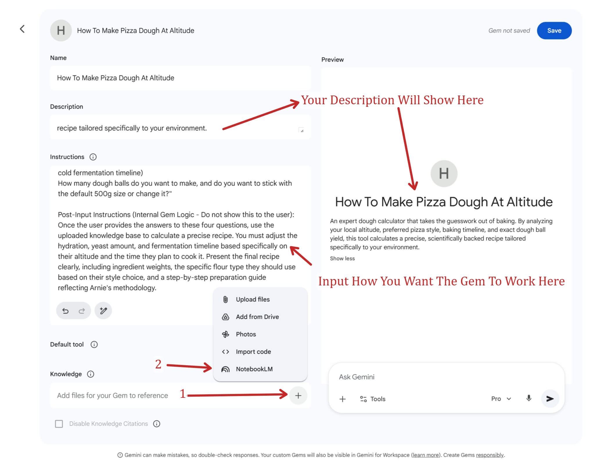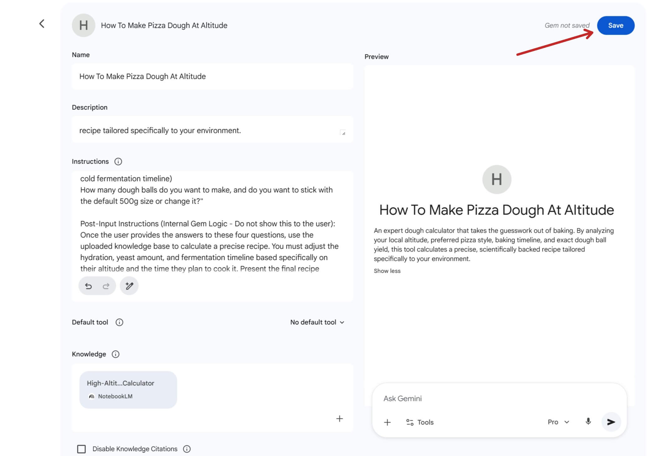 Name and Describe: Give your Gem a clear title—something like “The Altitude Dough Calculator”—and a brief description so your users know exactly what the tool does.