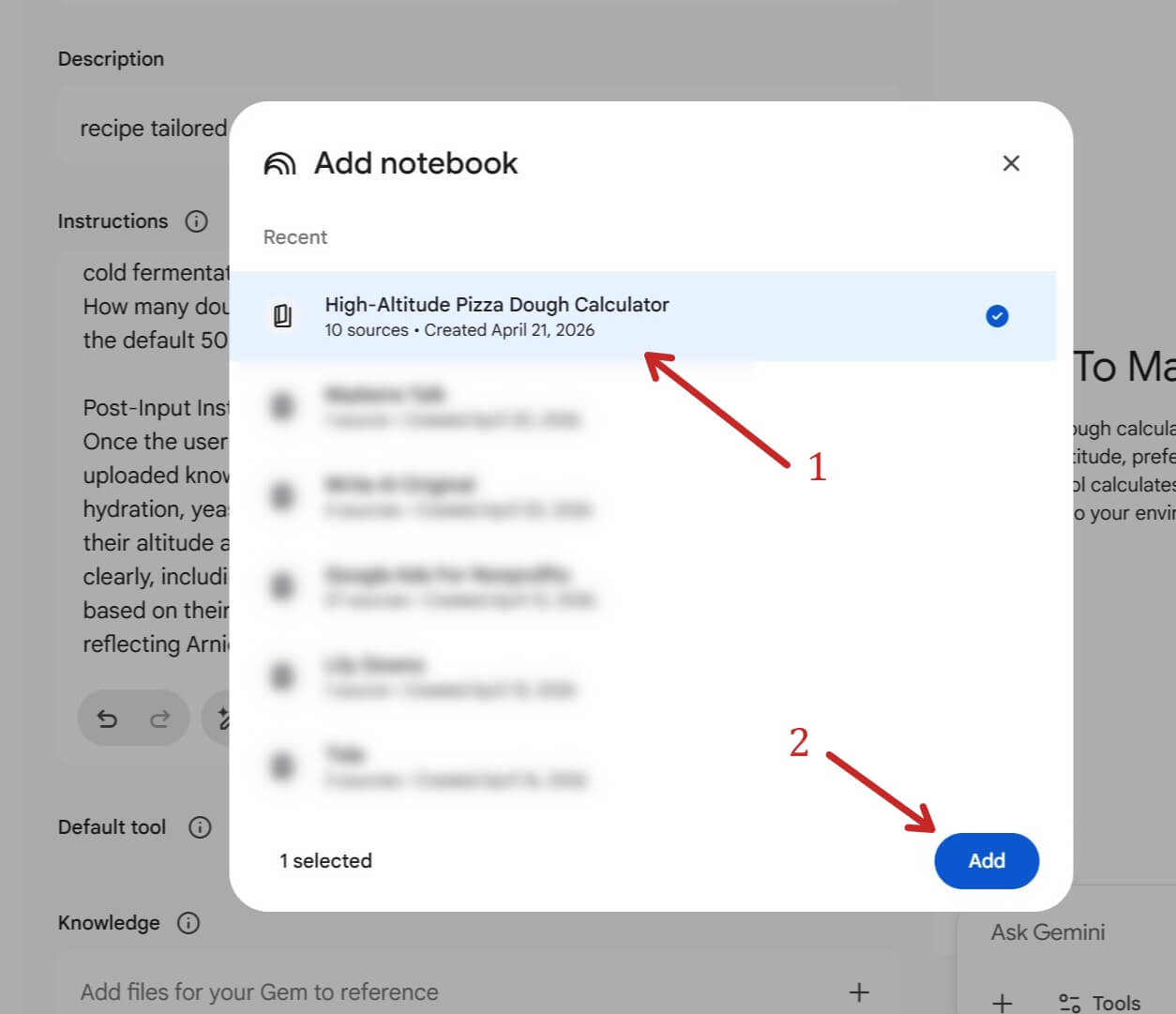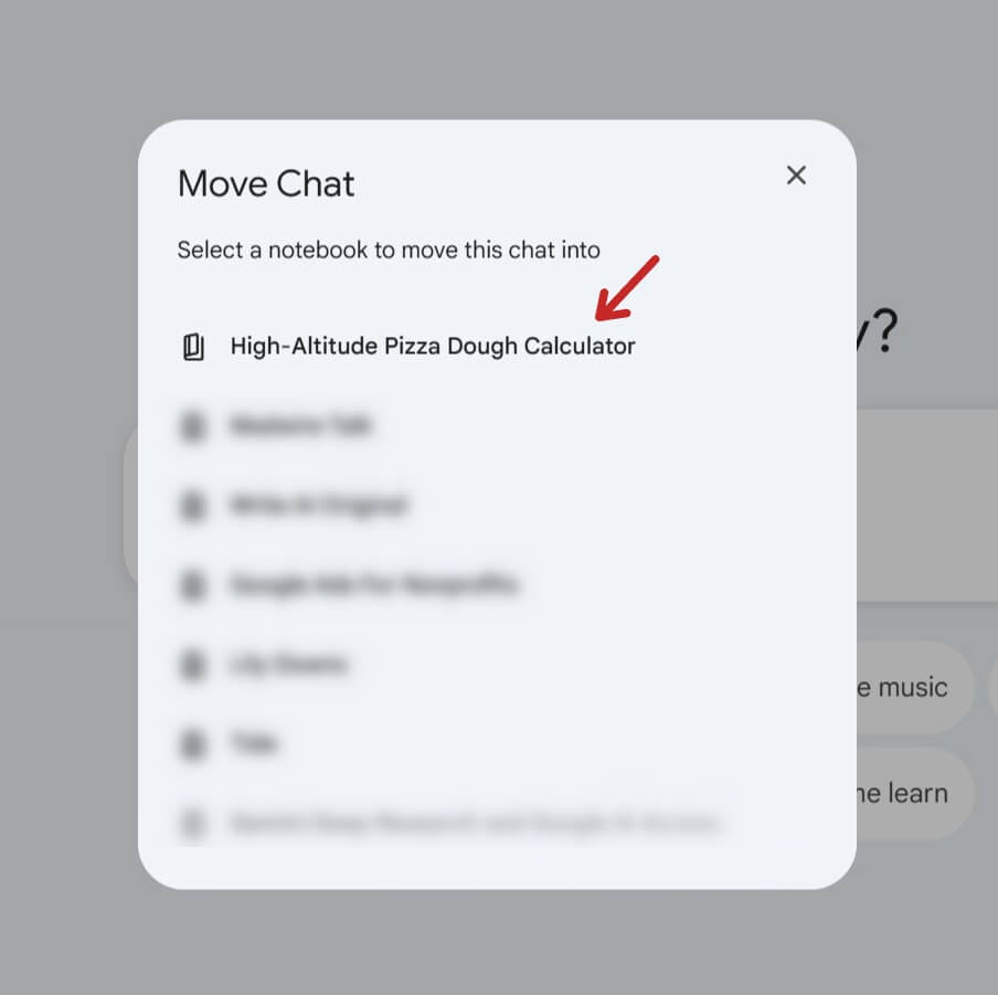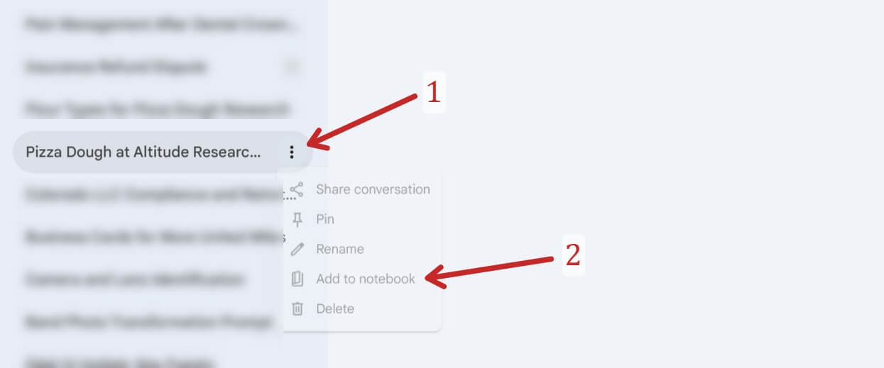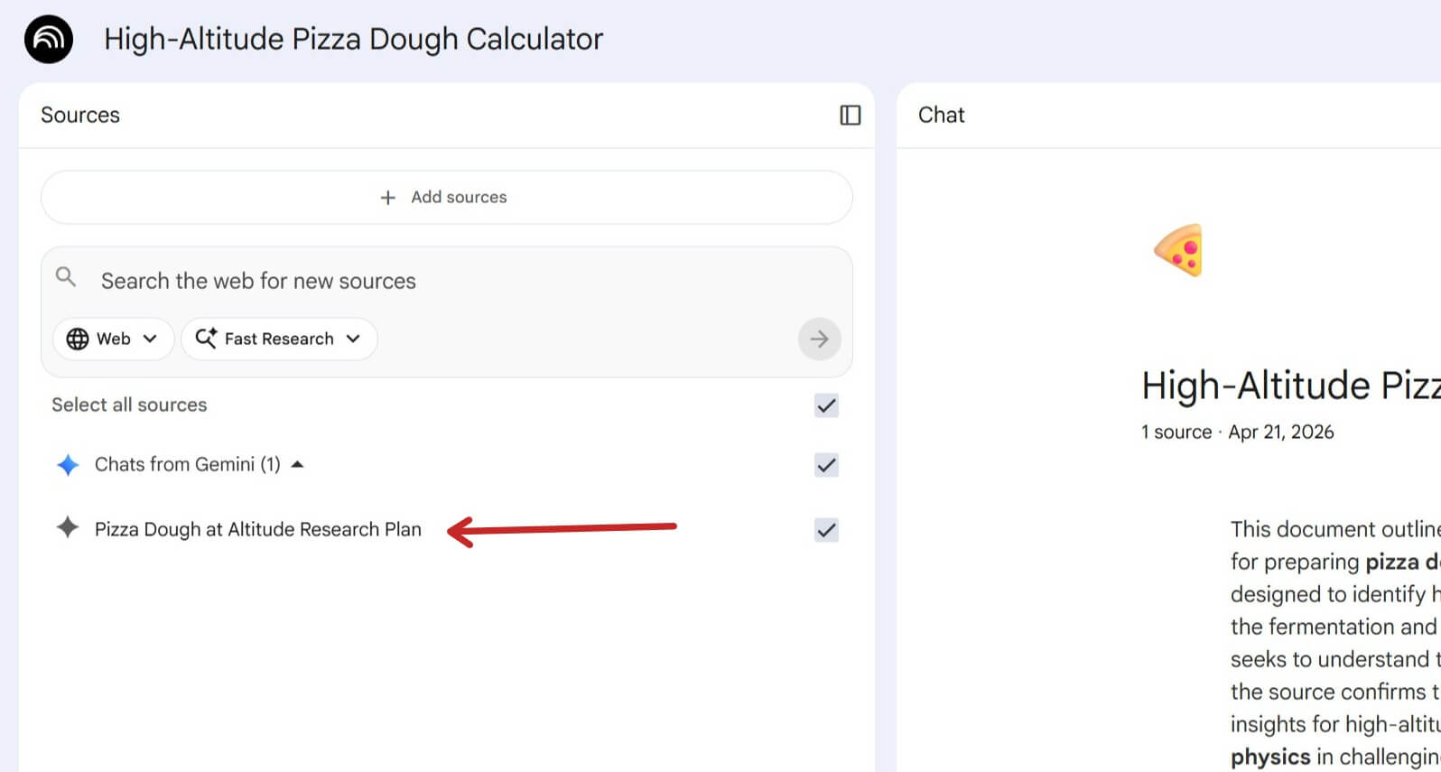 Locate your research: Go to your Gemini sidebar and find the specific conversation where you built your research (in my case, the “Pizza Dough at Altitude Research” chat).