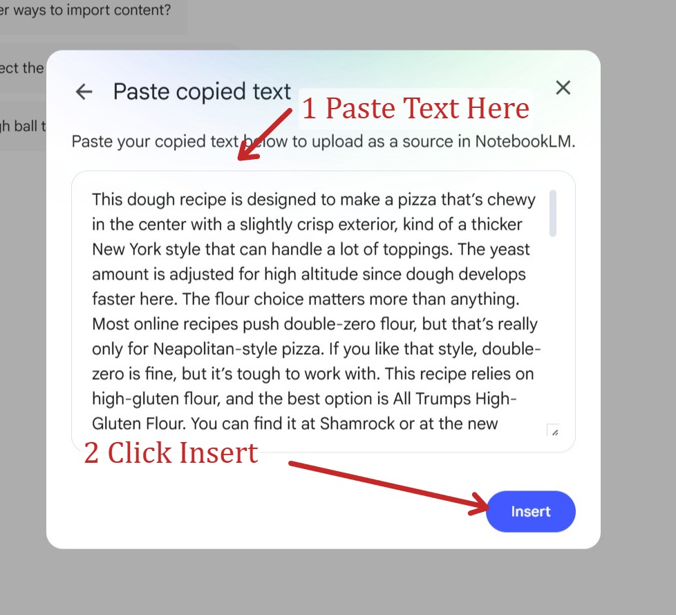 Pasting Direct Text : Sometimes your best data isn’t in a formal whitepaper; it’s in a casual message. I actually have an email I sent recently where I broke down my current dough recipe and step-by-step instructions to help a friend. In the NotebookLM source menu, you can simply click Add Source and then Copied text option as shown below: