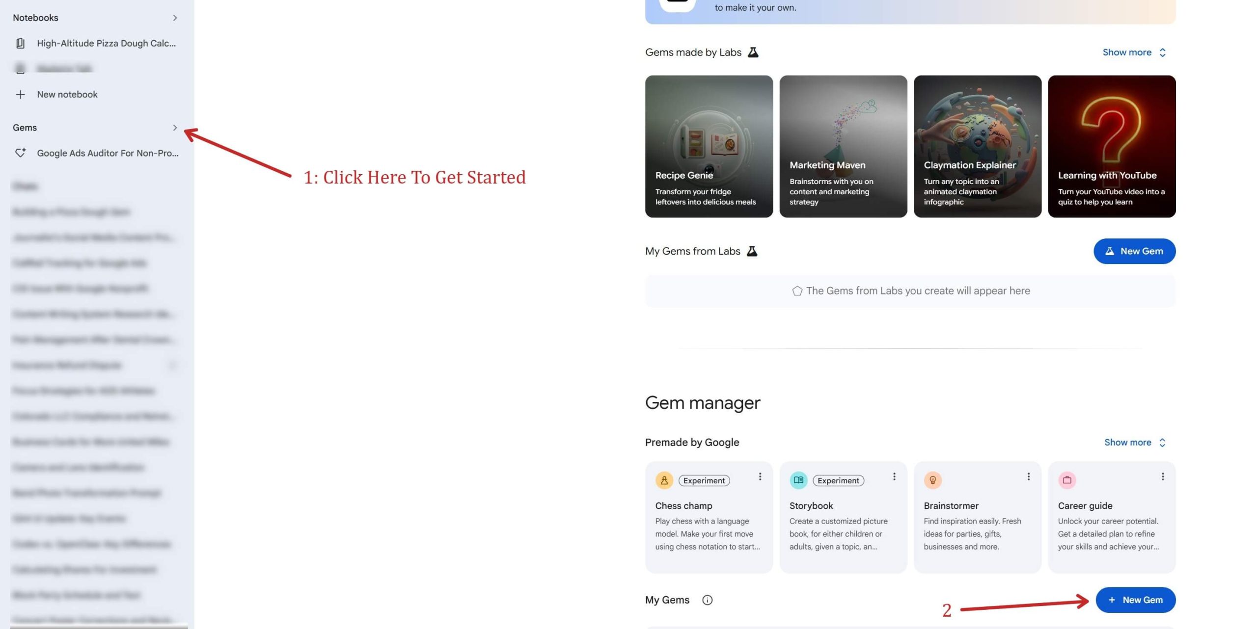 Start Building: Click the Create a Gem button to open the builder interface.