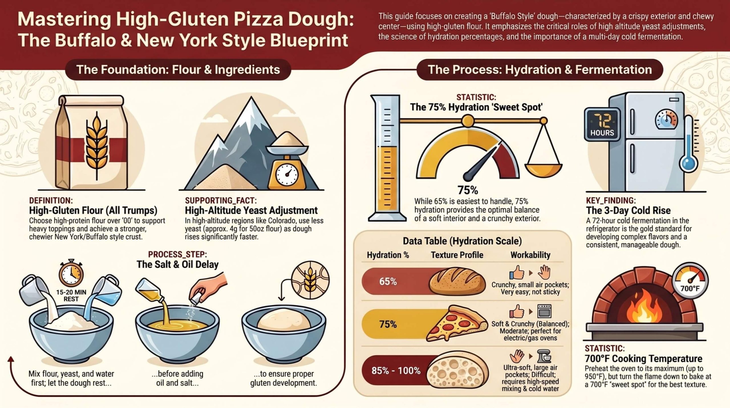 Most importantly, it visually synthesizes our critical data, like the precise Fort Collins high-altitude yeast adjustment (4g for 50oz flour), the necessary salt and oil delay process, and the specific 700°F temperature sweet spot for the best bake.