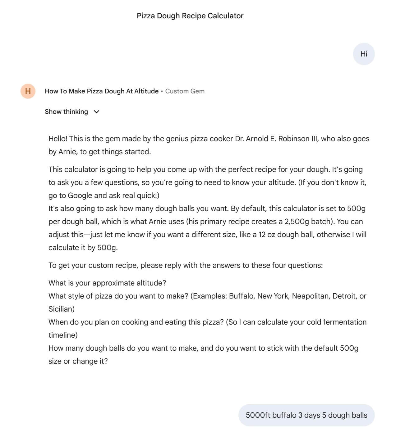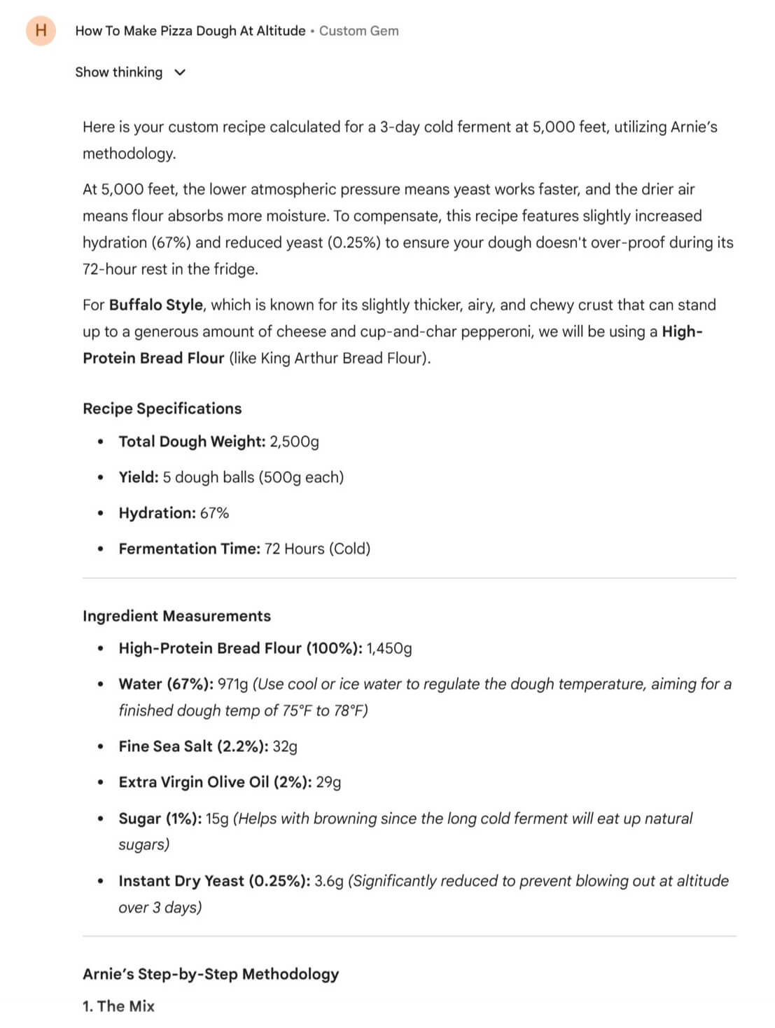 Look closely at the recipe specifications in the second screenshot. The Gem didn’t just calculate the math for a 2,500g batch; it actively applied the scientific parameters from our research. It recognized that at 5,000 feet, the drier air requires a slight bump in hydration (67%), and the lower atmospheric pressure means the yeast needs to be drastically reduced (0.25%) so the dough doesn’t over-proof during a 72-hour cold ferment. It even correctly recommended High-Protein Bread flour specifically for the Buffalo style crust.